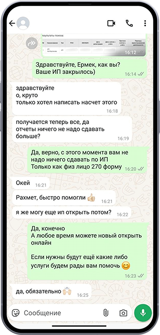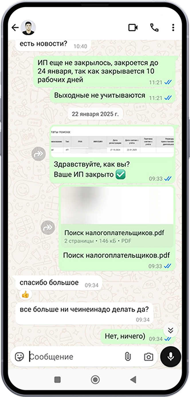 Проанализировав состояние ИП, мы сдали все необходимые отчеты, прошли протокол и сразу начали процесс закрытия ИП без необходимости в физическом присутствии предпринимателя